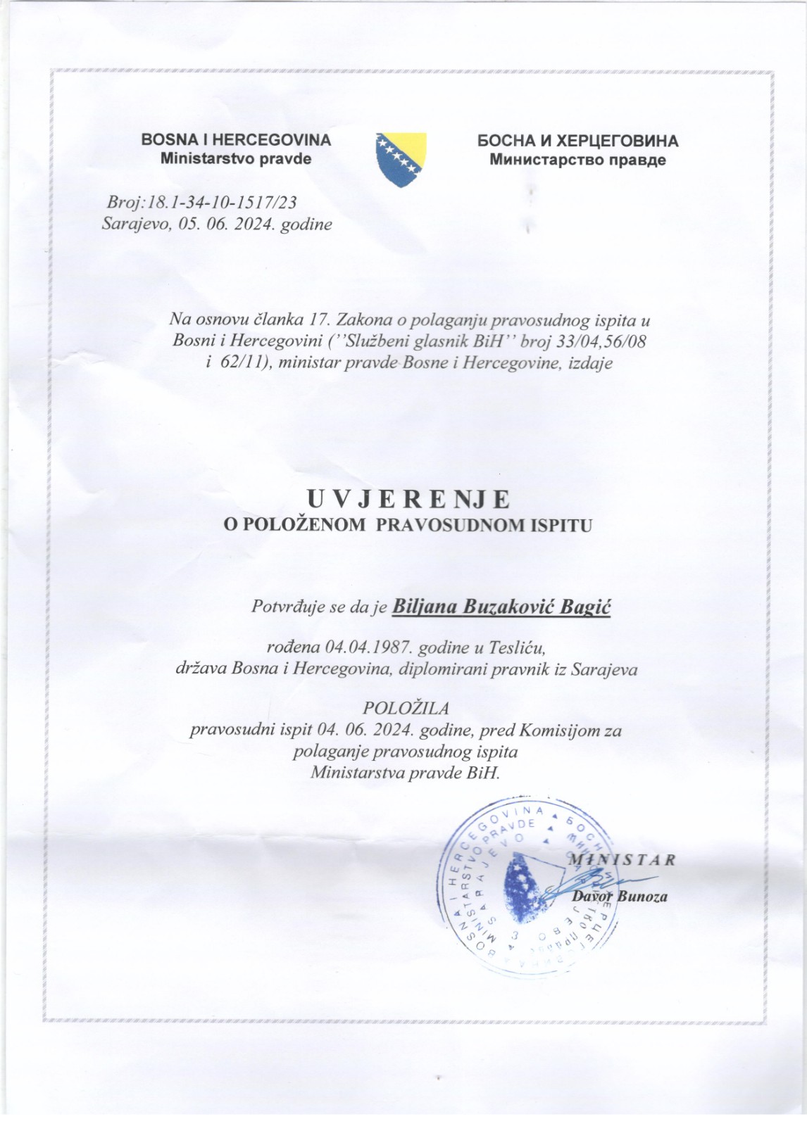 Dana, 04.06.2024.godine, Biljana Buzaković Bagić član advokatskog tima Buzaković uspješno je položila pravosudni ispit pred Komisijom Ministarstva pravde BiH. Naša koleginica je na ovaj način krunisala svoje stručno usavršavanje i stekla uslove za obavljanje svih pravosudnih funkcija u BiH ( advokatura, sudstvo, tužilaštvo , pravobranilaštvo i sl.) i upis u imenik advokatskih stručnih saradnika.